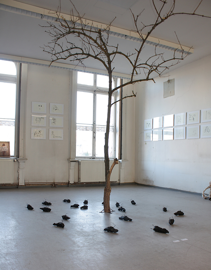 Blackbirds (Amseln), 12/2013. Paper, wire, concrete, dried tree; 250x150x150 cm.