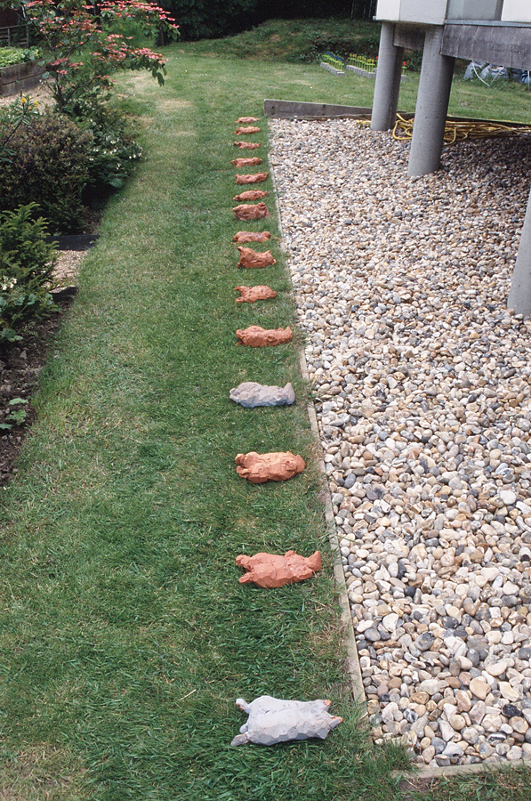 Two are blue, 06/2002. 15 clay moles. First shown as part of a room installation at Kloster unserer Lieben Frauen, Magdeburg,
