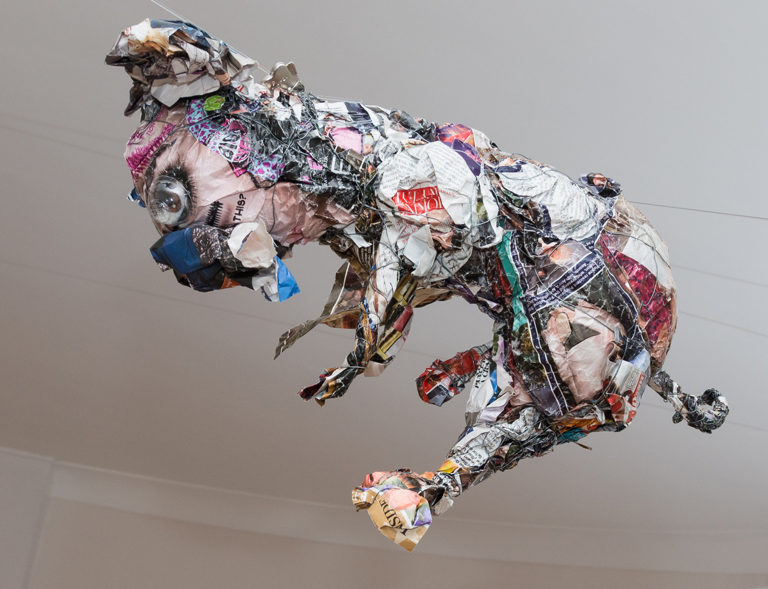 Love and compassion, children of chaos (detail), 02/2015. Room installation of two hanging figures; newspapers, magazines, wire, nylon thread. Site-specific installation as part of the exhibition Berlin–London: Contemporary Art by Woman, at German House (the former East German embassy), London SW1.