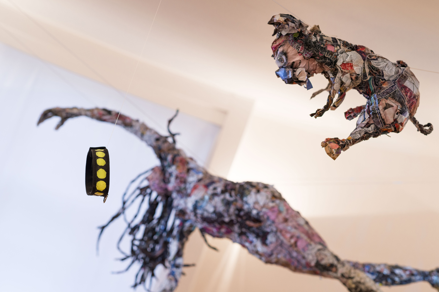 Love and compassion, children of chaos, 02/2015. Room installation of two hanging figures; newspapers, magazines, wire, nylon thread. Site-specific installation as part of the exhibition Berlin–London: Contemporary Art by Woman, at German House (the former East German embassy), London SW1.