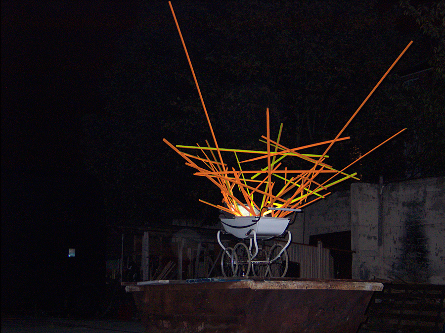 Untitled, 09/2007. Pram, wooden slats, fluorescent paint, site lighting; dimensions variable. Installation, Collision at Area 10, London SE15.