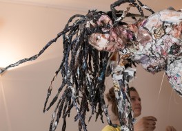Love and compassion, children of chaos (detail with ilka Leukefeld), 02/2015. Room installation of two hanging figures; newspapers, magazines, wire, nylon thread. Site-specific installation as part of the exhibition Berlin–London: Contemporary Art by Woman, at German House (the former East German embassy), London SW1.